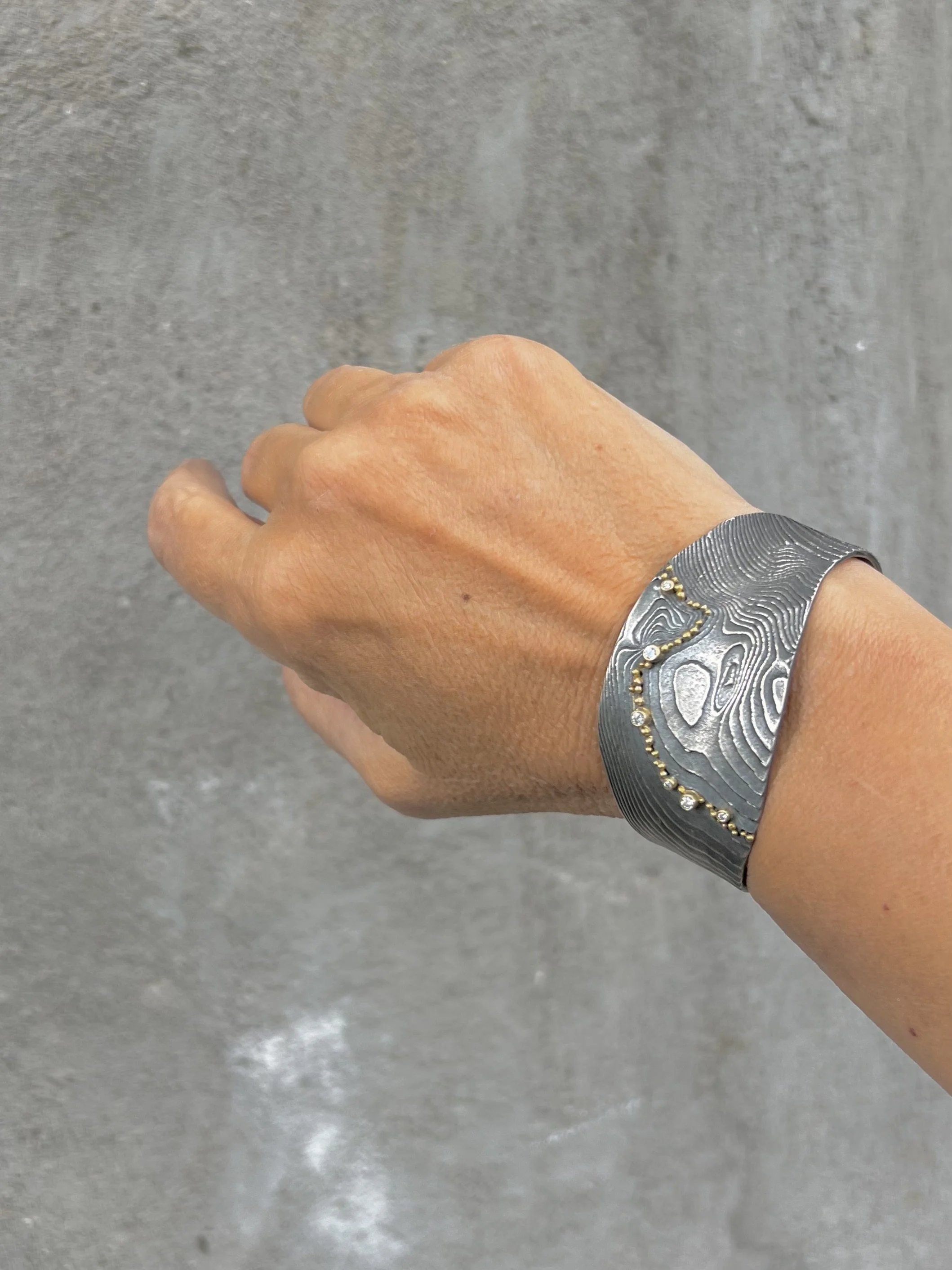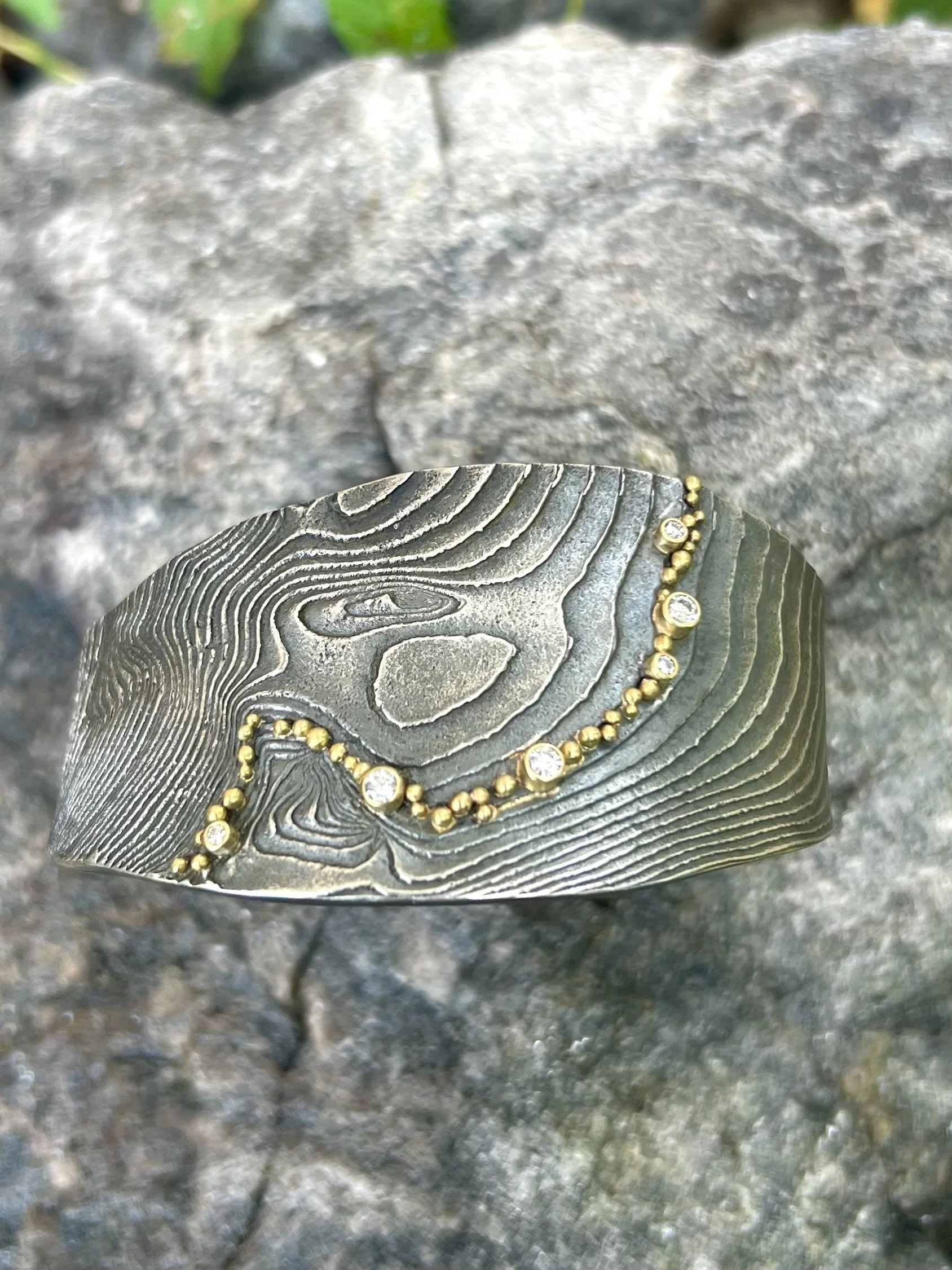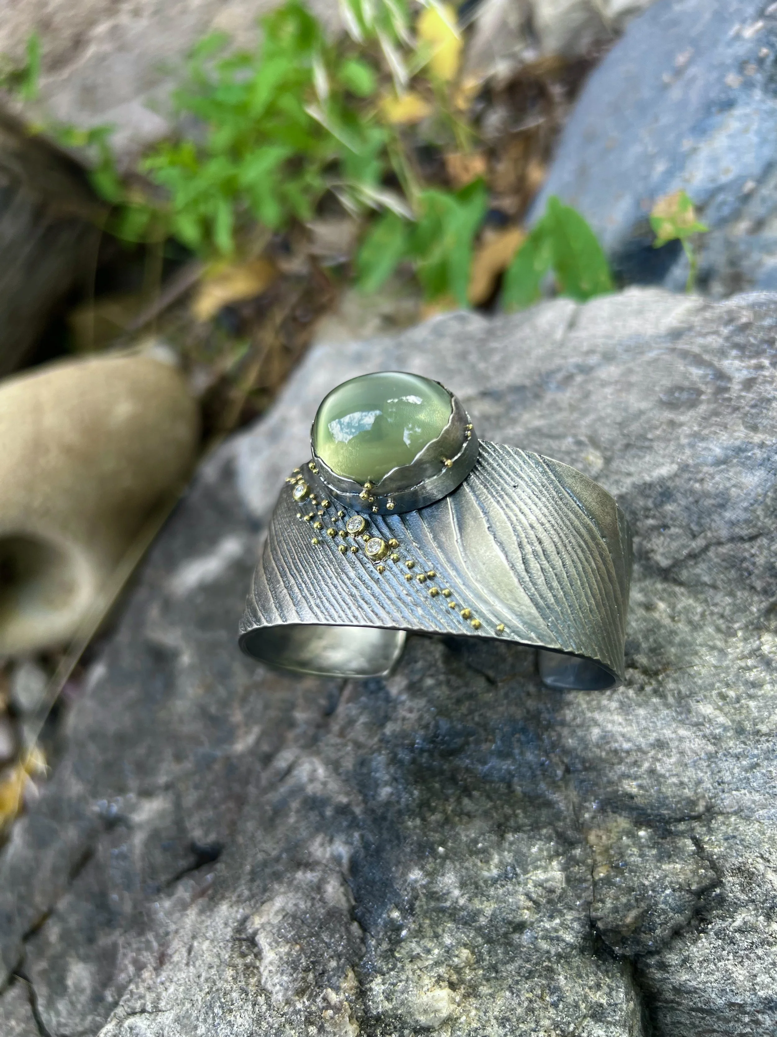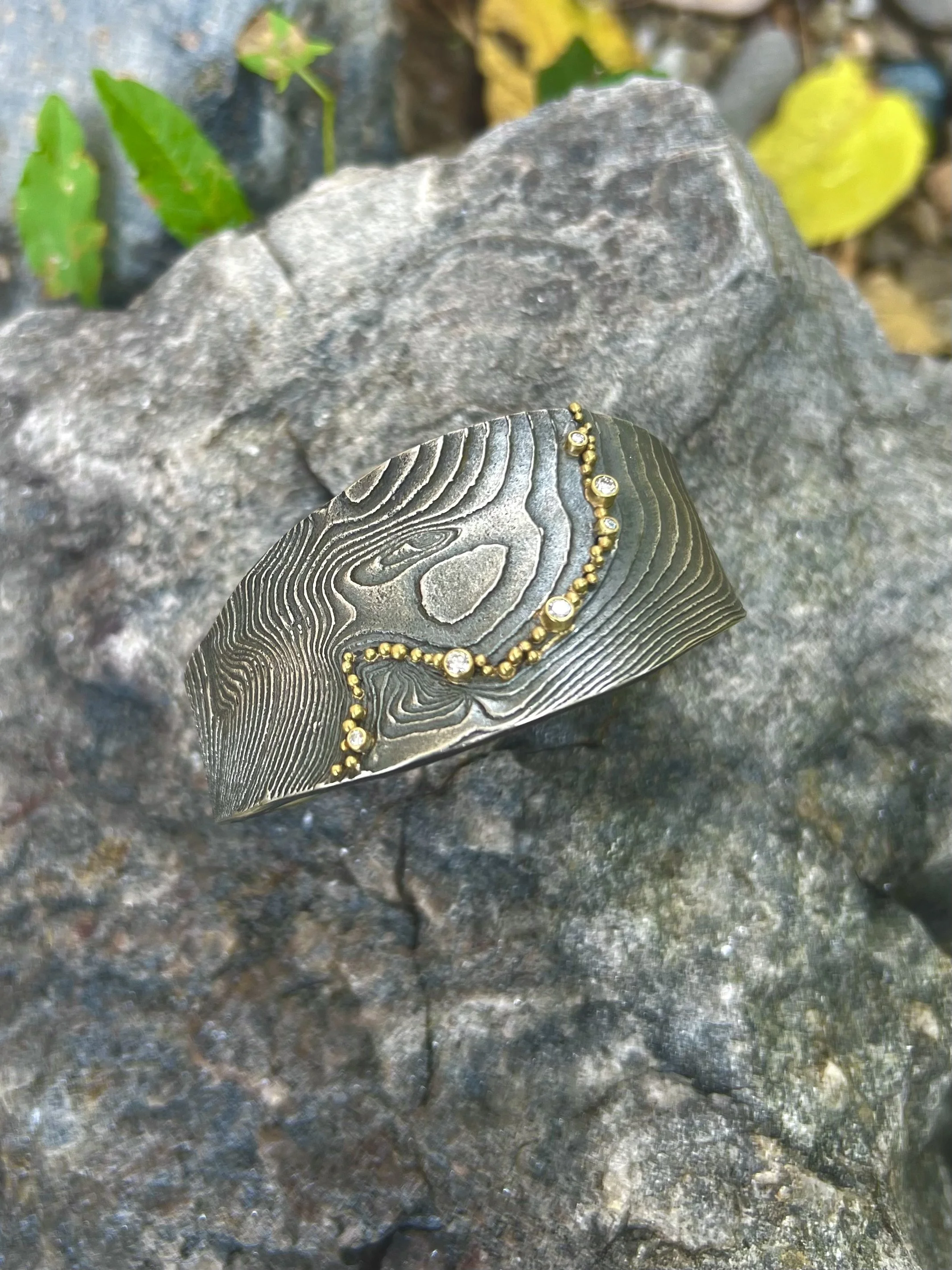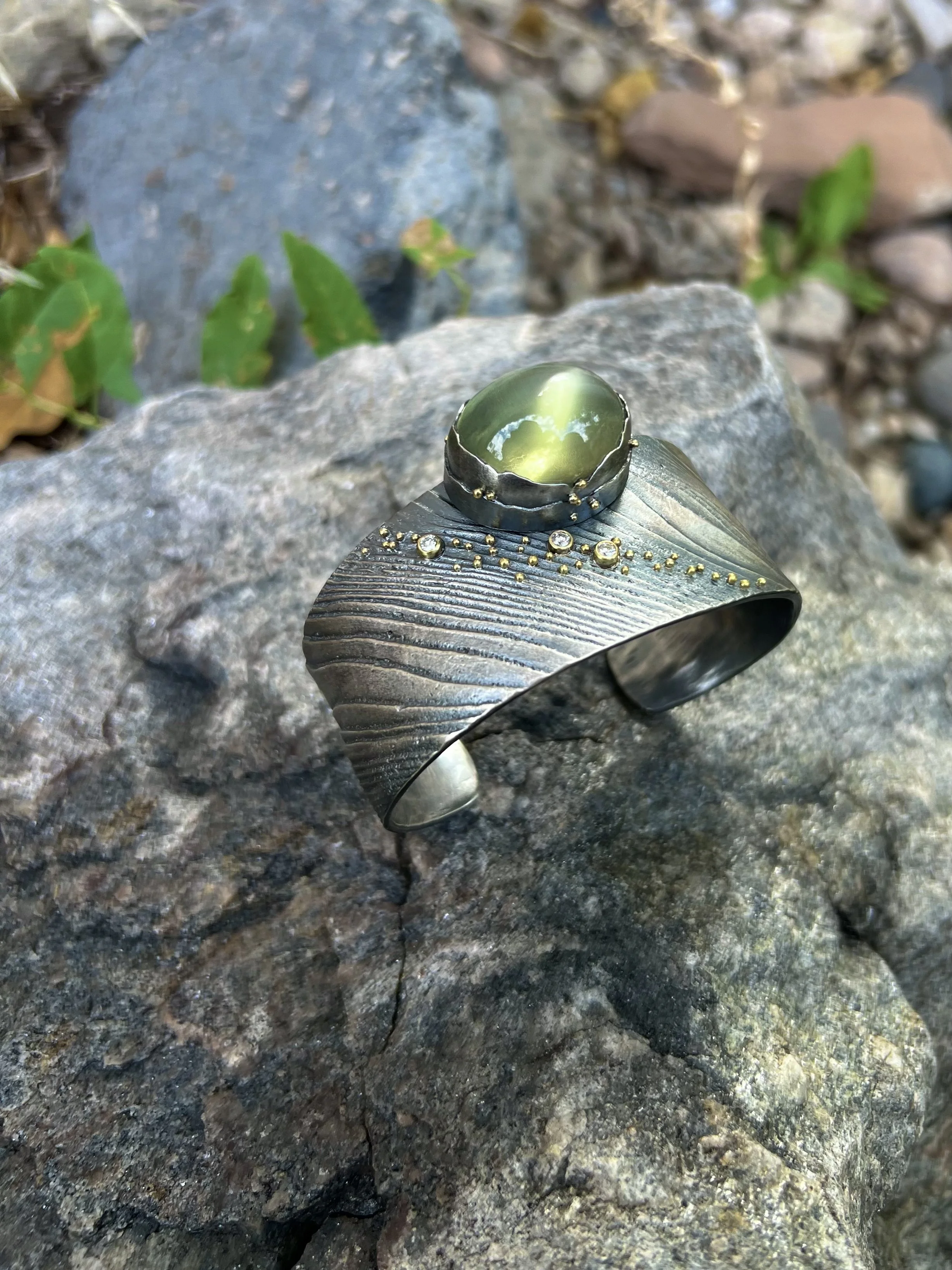 One of a kind ring with blue patterned boulder opal butterfly wings and a diamond head. She has landed on a sterling silver patterned band