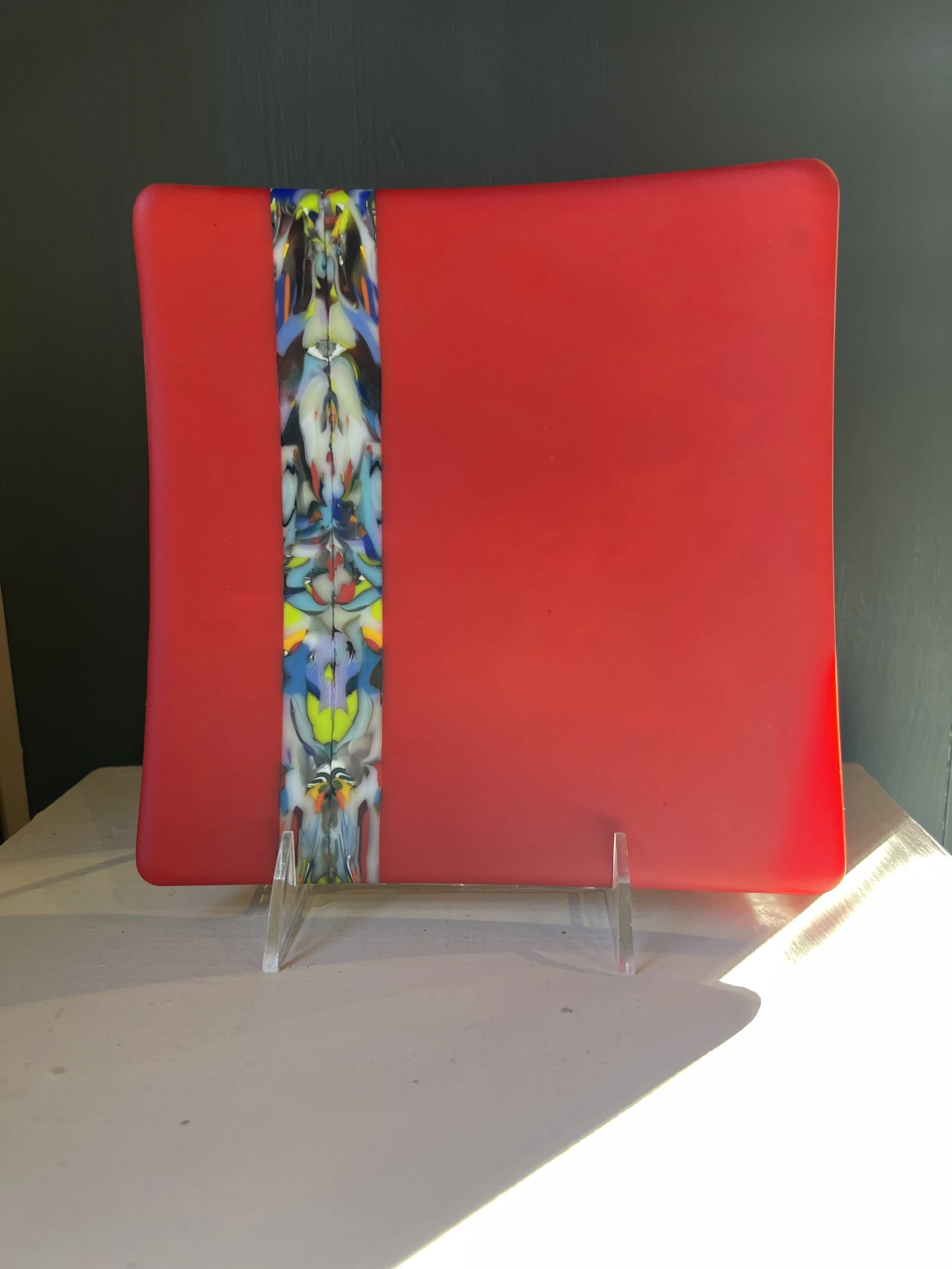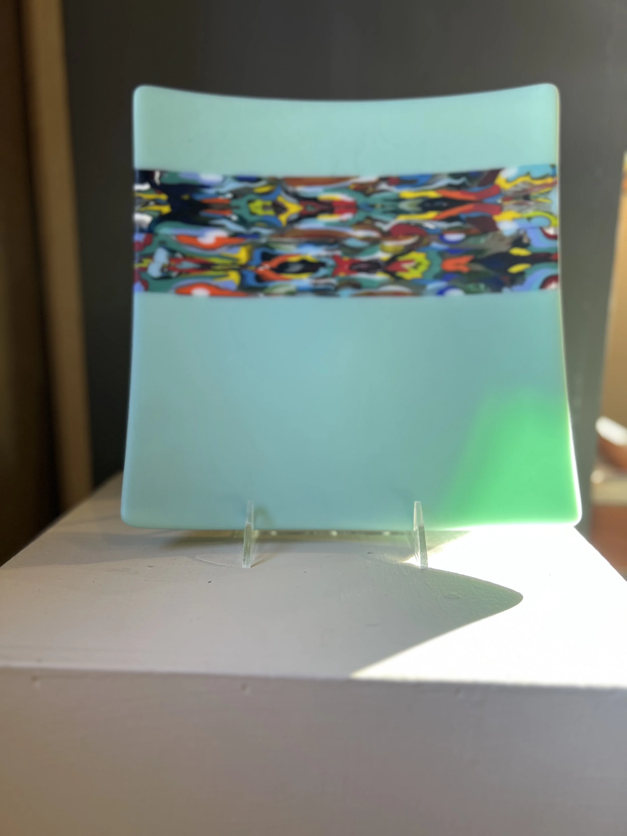 One of a kind fused glass tray by Taos artist Scott Messick. Tapestry series